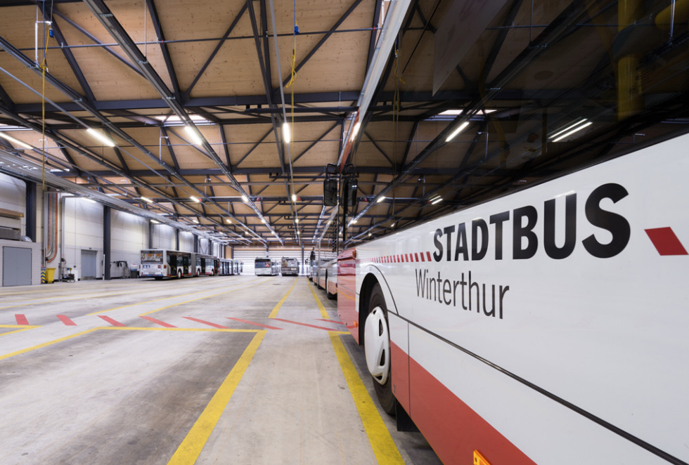 Der Neubau von Stadtbus Winterthur kann sich sehen lassen: Die Fassade aus poliertem Chromstahlblech glänzt schimmernd im Sonnenlicht und betont die architektonisch spezielle Bauweise des neuen Busdepots. Nach einer rund 20- monatigen Bauzeit sind die neuen Bushallen und der integrierte Verwaltungstrakt im Grüzefeld seit August 2015 in Betrieb. Mit dem alten Depot am Deutweg war Stadtbus Winterthur an seine Kapazitätsgrenzen gelangt, sodass mit dem Neubau eine möglichst komplette Lösung angestrebt wurde, die sowohl wirtschaftlichen als auch ökologischen Ansprüchen gerecht wird. Das Ziel war eine möglichst langfristig planbare Lösung, um den Grundstein für weitere Entwicklungsmöglichkeiten zu legen.